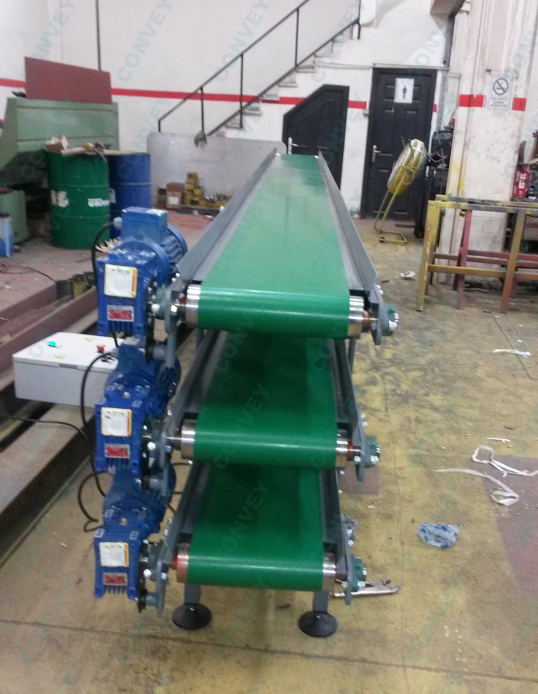 These conveyors are manufactured for a potato chips factory in order to consolidate mass production.